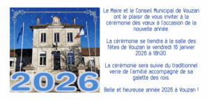 Le Maire et le Conseil Municipal de Vouzan ont le plaisir de vous inviter à la cérémonie des vœux à l’occasion de la nouvelle année. La cérémonie se tiendra à la salle des fêtes de Vouzan le vendredi 16 janvier 2026 à 18h30. La cérémonie…